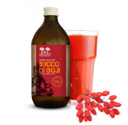 Il Succo di Goji Prima Qualità è un integratore alimentare liquido che apporta naturalmente Vitamina C. E'ottenuto da spremitura a freddo di frutti di Goji (Lycium barbarum L.) originari degli altopiani asiatici. Questi frutti contengono tantissimi microelementi davvero preziosi: calcio, zucchero, fosforo, potassio, manganese, lipidi come gli omega 3, magnesio, cromo, vitamine C, E e vitamine del gruppo B, carotene, amminoacidi, fibre, luteina, germanio etc . . . La loro particolare composizione li rende un rimedio per contrastare molte problematiche, utile ad abbassare il livello di infiammazione nel corpo.